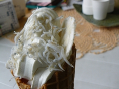 「ジャコソフト」日本(多分世界で)でここだけのデザート!バニラソフトの上に「ちりめんじゃこ」がのっています。(中にもいっぱい)はっきり言って見た目が変ですが、「スイカに塩をかける」感覚で、甘味が引き立ちます。 |