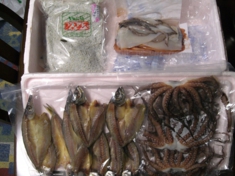 今日買った海産物の数々。タコ、イカ、アジ、カマス、ジャコ。おいしそ〜 |