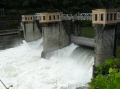 「上麻生ダム」こちらも大正15年完成の歴史ある産業遺産です。前日からの雨で、ものすごい水量になっています。 |