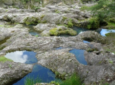 これは甌穴と呼ばれる濁流による侵食が作り出した丸い穴です。水面からはかなり高い所にありますが、昔ここにも水が流れていた証拠です。甌穴に溜まった水に空が映り込み美しい風景を作り出していました。 |