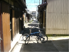 ちょっと町中に入ると細い路地になります。自転車ぐらいの幅です。 |