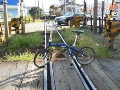 線路の上に自転車を乗せてみました。これで細いのが分かるでしょうか。ちなみに軌間(ゲージ)は762mm(30インチ)です。 |
