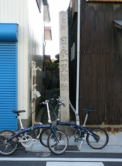 「日永の一里塚跡」建物に挟まれて、自転車では多分見過ごしてしまいます。向かいの製茶工場が気になって立ち止まったので見つけることができました。 |