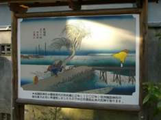 歌川広重東海道五十三次の「三重川」四日市を描いたものです。(この看板は諏訪神社の前にありました) |