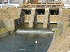 「黒川樋門」昔はこのあたりが貯水池になっていて「天然プール」と呼ばれていました。黒川、庄内用水、御用水、志賀用水、上飯田用水へ樋門を使って分水していたそうです。ポンプ場ができてプールはなくなりましたが(昭和52年)、明治築の黒川樋門が昔を偲ばせています。 |