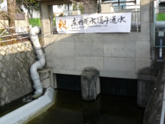 庄内用水の現在の実質的な始まり。通年通水は始まっていましたが、水門は閉まっていました。水利権の都合で庄内川からの導水はできないそうです。その代わりに左に見える白い配管から下水の再生水が流れています。少し違和感を感じますが、とてもきれいな水が流されています。 |