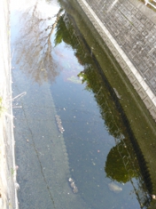 川の所々に「魚だまり」と呼ばれる深みが作られていました。通水を止めたときに魚が避難するためのものらしいです。底にかわいい小学生のタイル画が飾られていました。 |