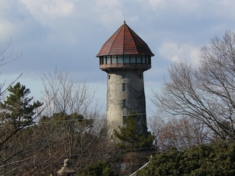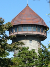 ついに「東山給水塔」とご対面。ちょっと遠目ですが、歩道橋の上から全景が見えます。意外に大きかったです。(高さ38メートル)給水塔というのは、塔の上部に水を溜めたタンクがある構造のものです。ですが、どうしてこんなかわいい展望台がついているのか不明。 |