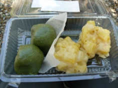 ☝おやつに「鬼まんじゅう」と「草餅」。この周辺は和菓子屋が多く、鬼まんじゅうが名物です ☞御器所(ごきそ)町でお地蔵様を見つけました。みんな町の人に大切にされているのが印象的でした |