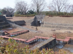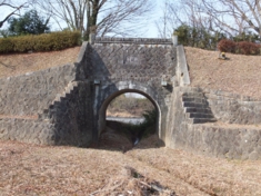 樋門(トンネル)が、奥の矢作川と通じています。左のスロープは製材所に通じています。川の中流域に貯木場があるのはとても珍しいそうです。でも上流にダムができたため、昭和5年には使われなくなってしまいました。 |