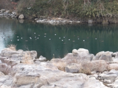 この辺は「勘八峡」といって昔は一大観光地だったそうです。今は人も少なく、カモがゆったりと泳いでいます。 |