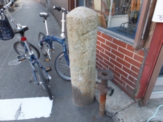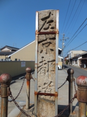 長光寺前の道標。かなり壊れていて鉄のアングルで補強されています。「左 京都道」「右 ぎふ」「文政二年」と書かれているのがわかります。文政二年というと1819年ですね。 |