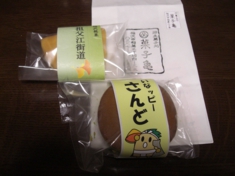 商店街の和菓子屋さんで購入したお菓子。上のはイチョウで有名な祖父江にちなんで銀杏が入っています。いなッピー(稲沢のキャラクター)さんどには、稲沢で売り出している明日葉が入っています。どちらも美味しかったですよ。 |