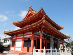 「先聖寺」あまりの色の鮮やかさにあっと驚く、唐風のお寺です。住職さんが親切に建築様式について教えてくれました。 |