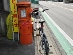 今は珍しい現役の丸ポスト。さらに、このポストは明らかに背が低いのです。しゃがまないと郵便物を入れることができません。ある時、何らかの理由で、道路をかさ上げしたのでしょうね。 |