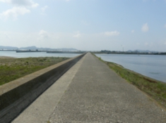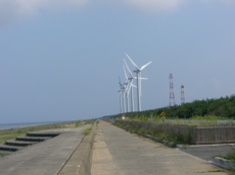 最初は堤防道路にそって北へ、「立馬崎」を目指します。。左が伊勢湾になります。目指す岬の方には渥美火力発電所の煙突と風力発電所の風車が見えます。 |