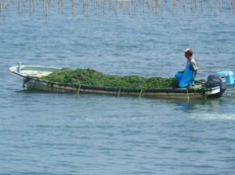 海苔を収穫しています。熊手のようなもので手作業でとっていました。のんびりとした風景です。 |