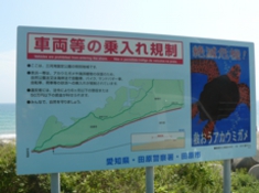 「車両等の車乗り入れ規制」の看板。隣には中学生の書いたウミガメの絵が。この砂浜にはウミガメが産卵にくることを知りました。車の乗り入れは、産卵や子ガメの旅立ちにとても悪い影響を与えるそうです。 |