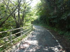 「伊良湖岬」に到着する直前に小高い峠を越えます。常緑樹に覆われた森の中を走ります。 |