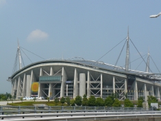 新豊田駅から少し走ると、名古屋グランパスの試合などが行われる豊田スタジアムが見えてきます。 |
