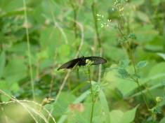 黒いアゲハチョウもたくさん見かけました。ふ〜わ、ふ〜わと飛ぶアゲハチョウで、いつも見るクロアゲハとは違うようです。図鑑で調べるとジャコウアゲハとわかりました。 |